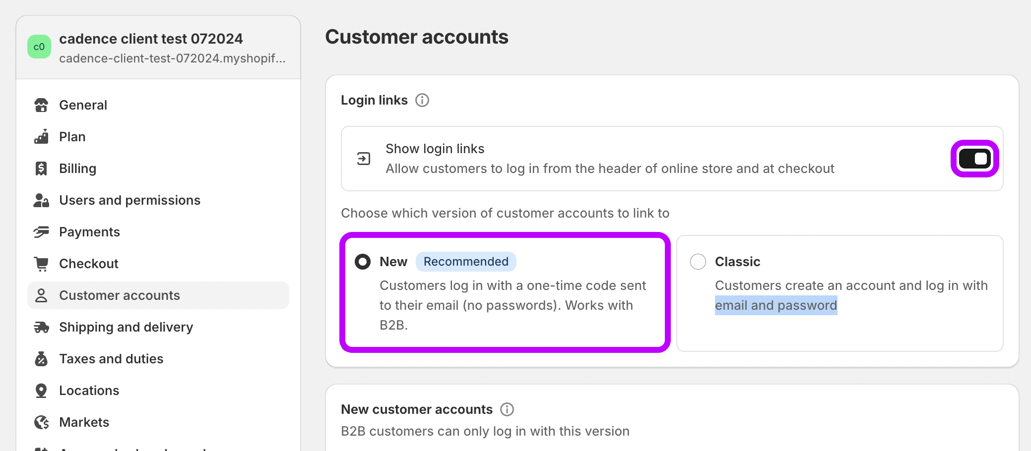 Choose the "new" customer account option. (Note: this is also called "Customer accounts"). We do not support "Classic" or "Legacy" customer accounts.