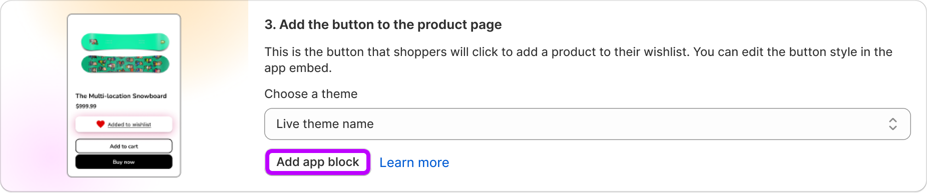 Choose the theme you want to add the "Add to wishlist" button to and click "Confirm." The button will automatically be added to your theme's product page. You can change its location however you like.