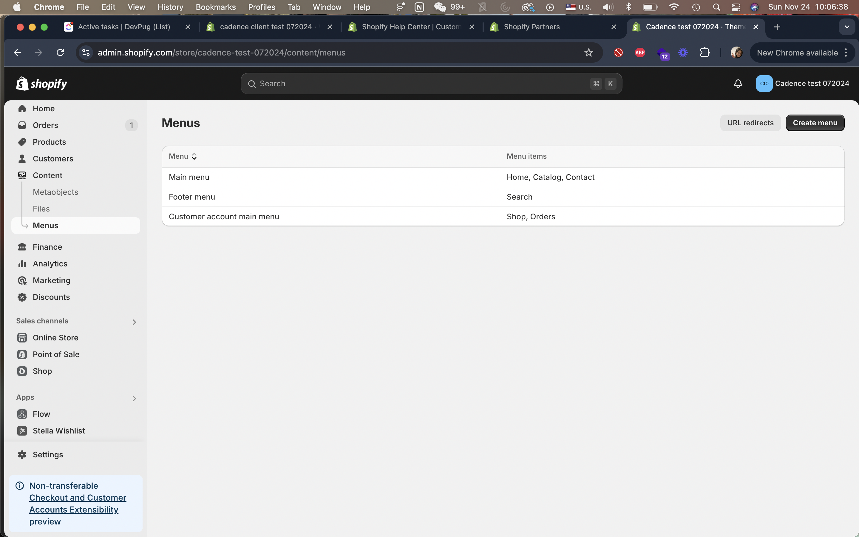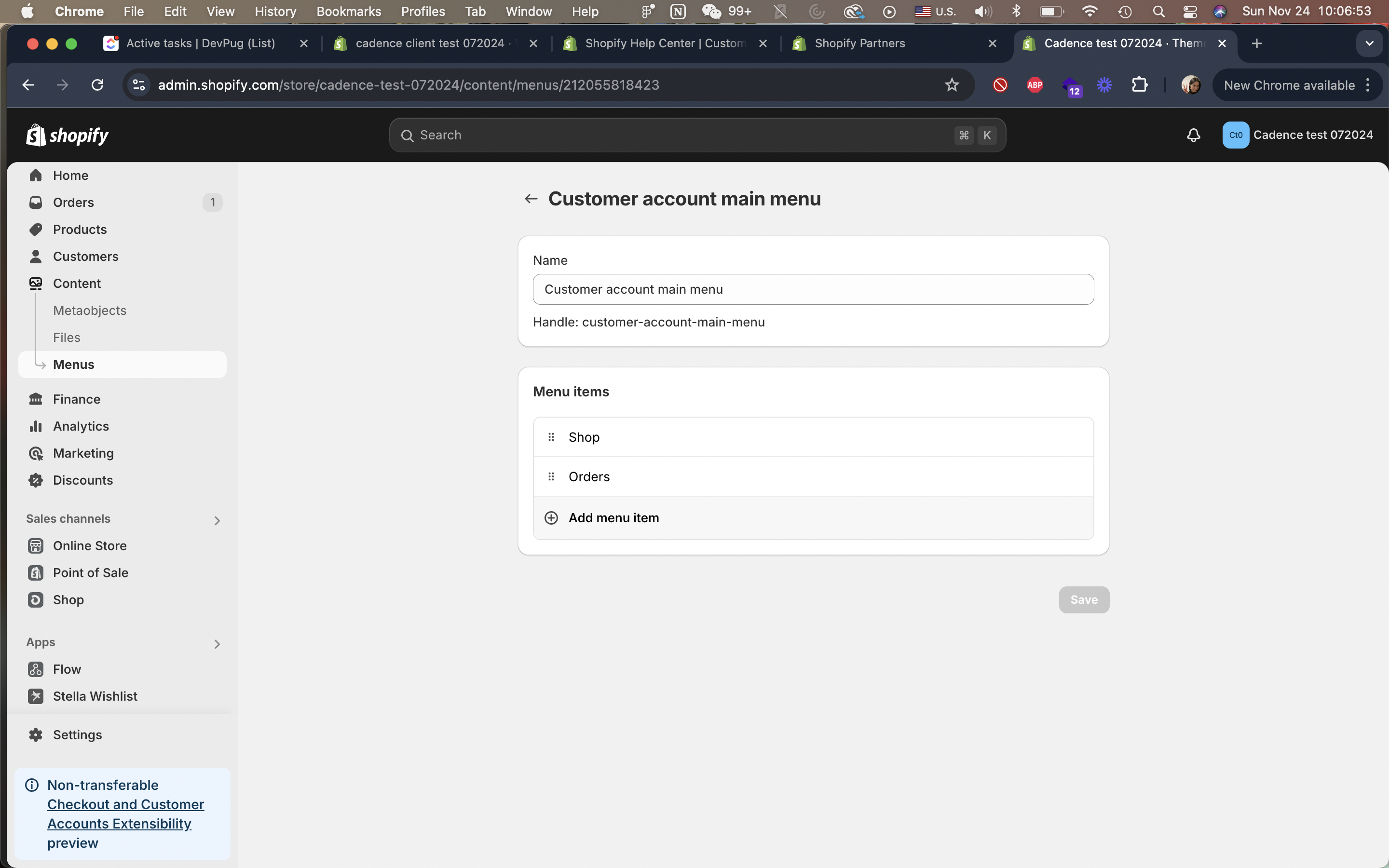 1. In your Shopify admin, go to Content > Menus > Customer account main menu. This will be available if you have activated customer accounts. To get help activating customer accounts, see here.