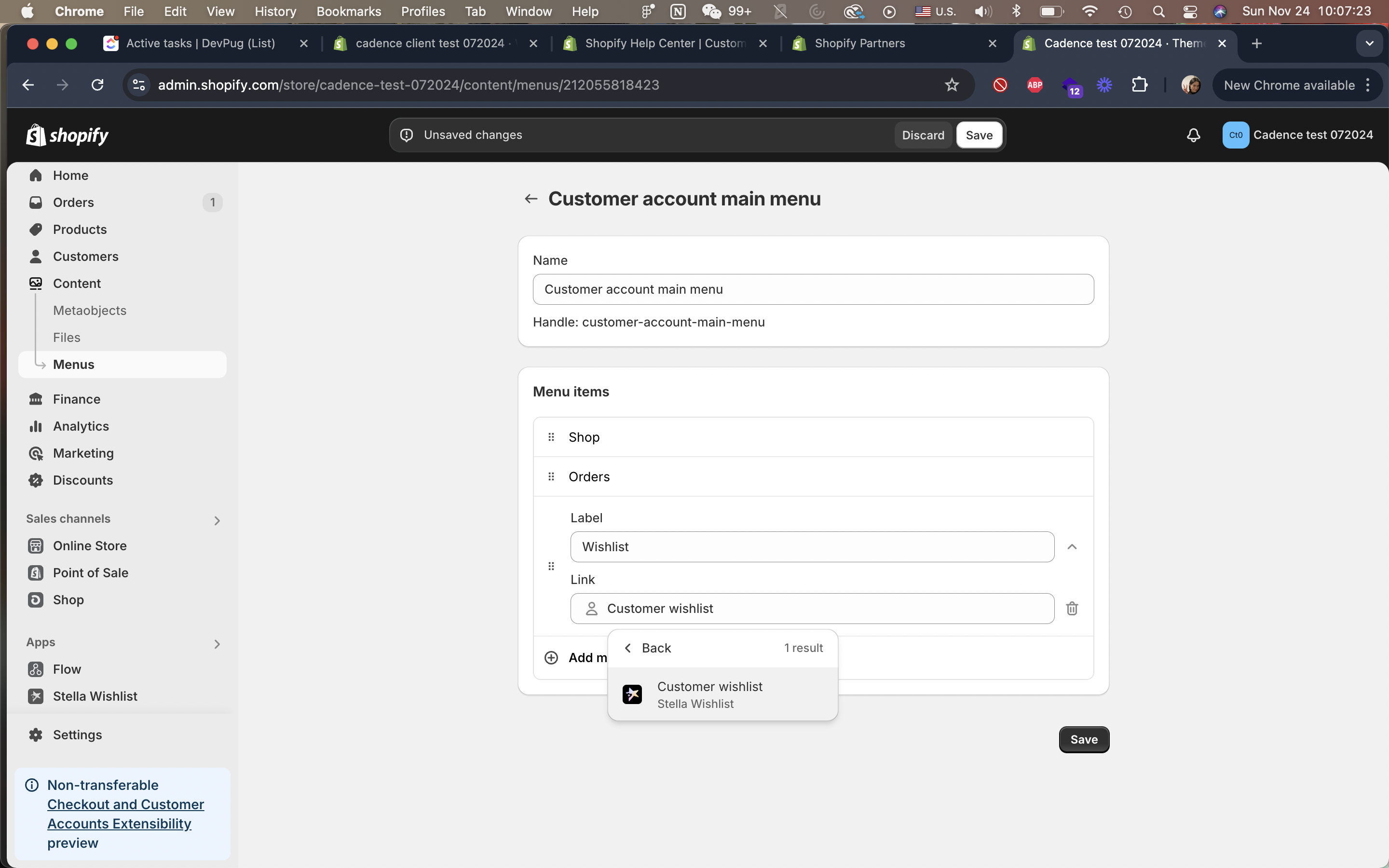 3. Label your wishlist. In the "Link" section, press Apps > Customer wishlist (Stella Wishlist). Press save.